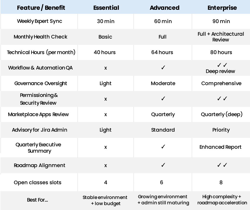 Let’s tailor the right NEEDS tier based on your roadmap, internal structure, and expected Atlassian demand.